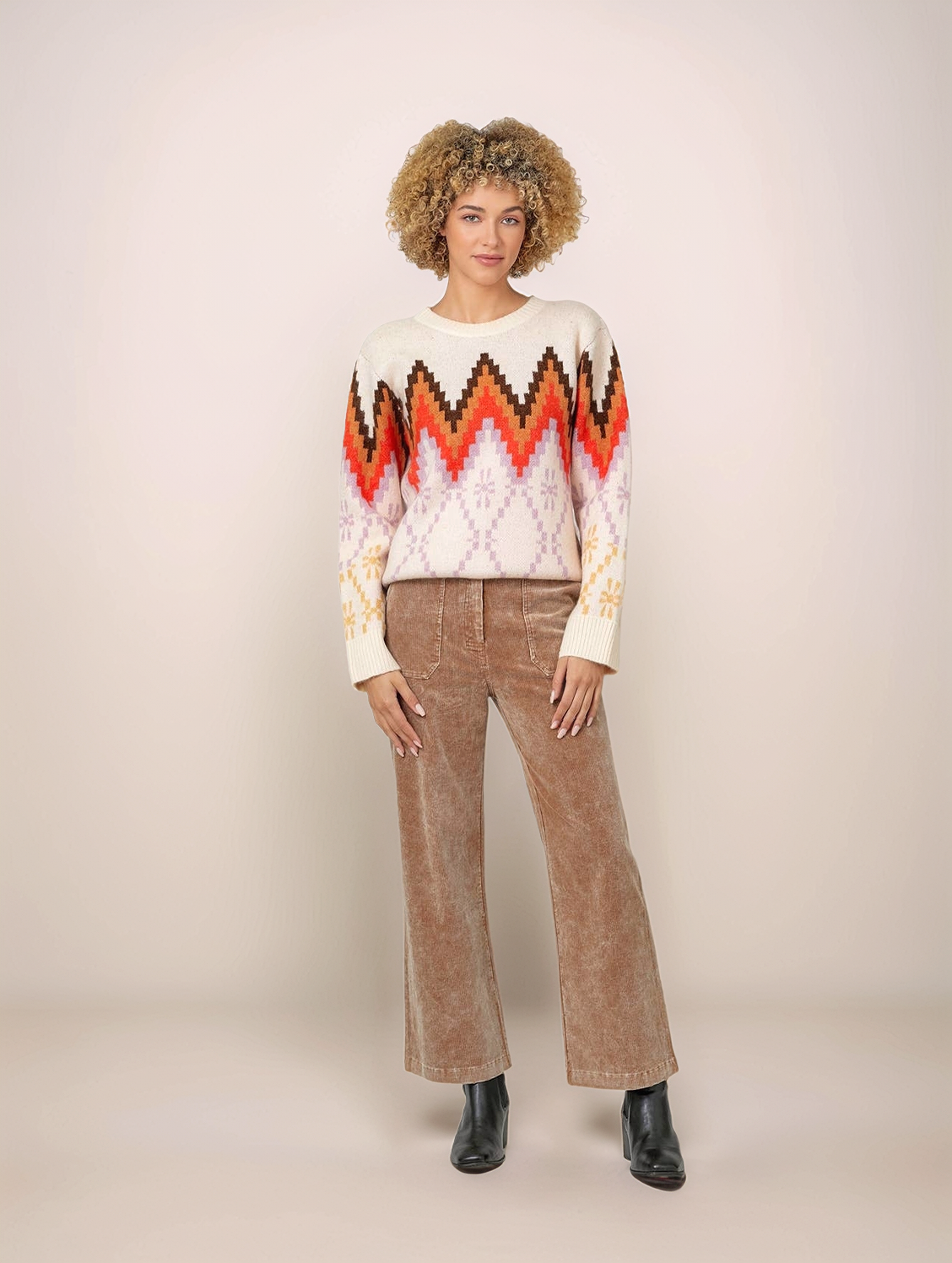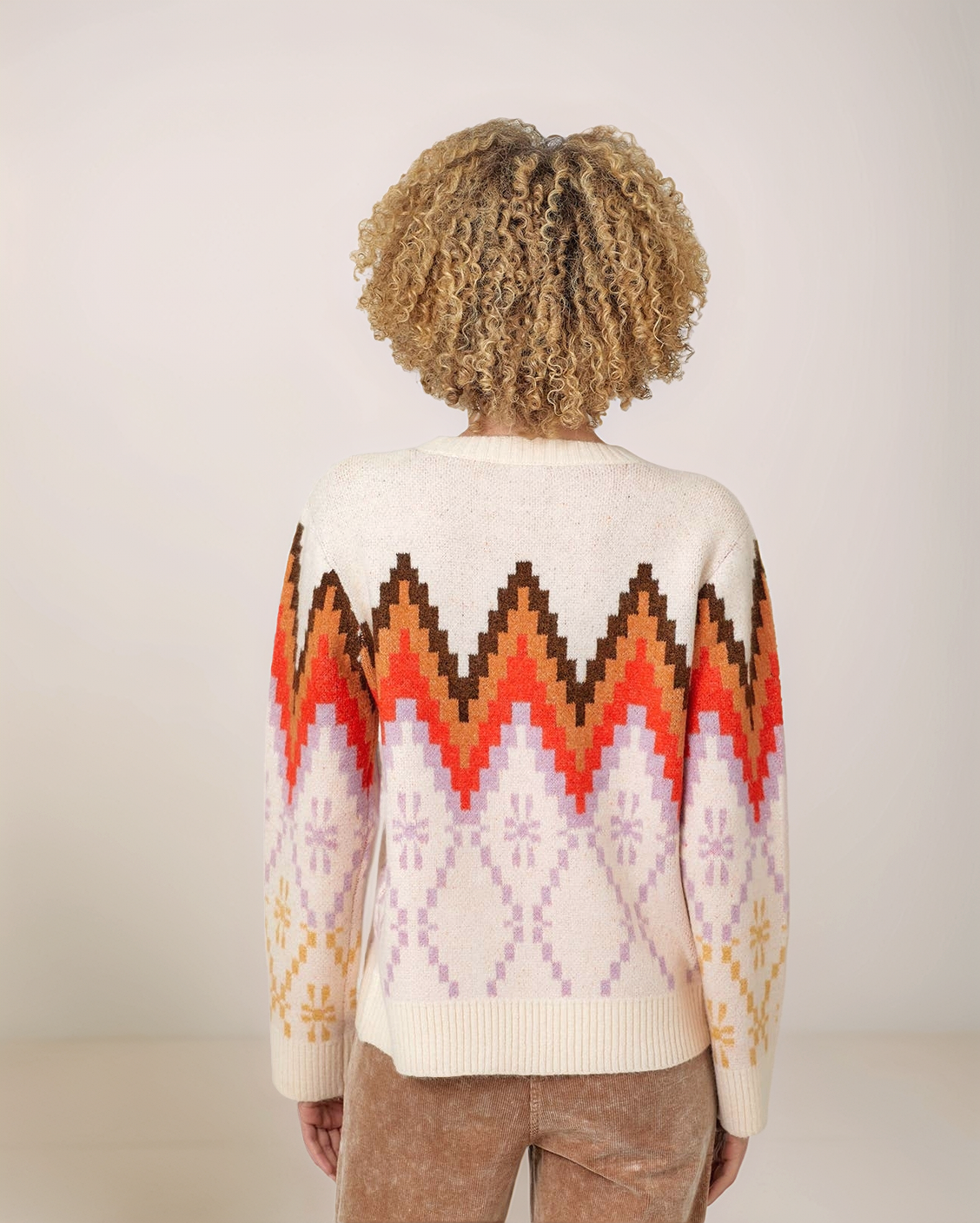 A bold, graphic Fair Isle pattern unfolds across the chest in a stunning, 70s-inspired palette of burnt orange, rich brown, and soft lilac. This intricate jacquard knit is a modern nod to timeless ski lodge style. Crafted from a sumptuously soft and cozy knit, this pullover is designed for warmth and comfort. The classic crew neck and relaxed fit make it an easy, endlessly wearable staple.