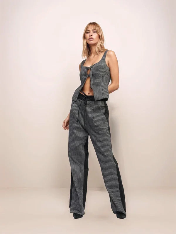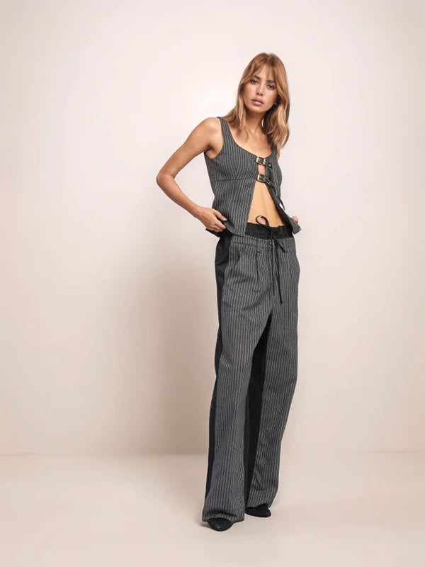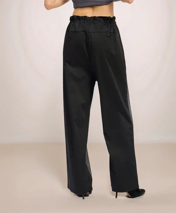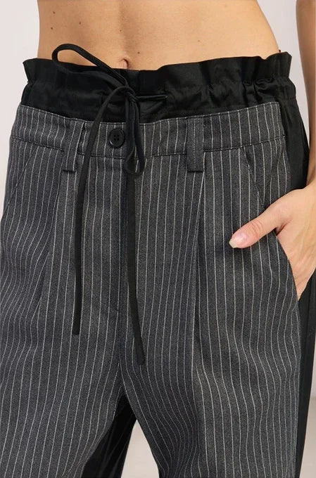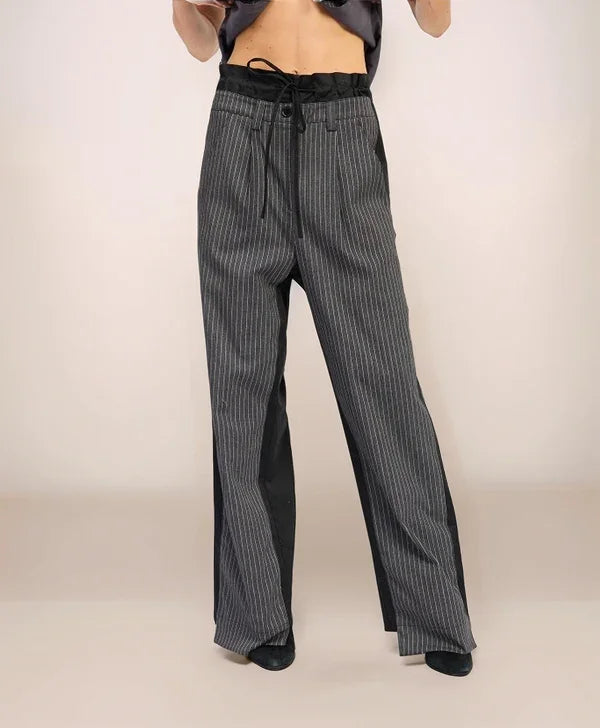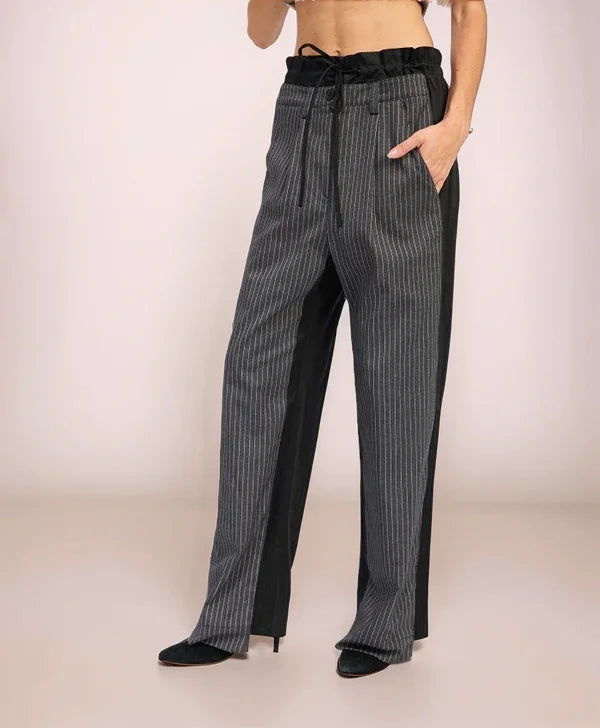 Experience a unique design where a sharp, grey pinstripe front meets a sleek, solid black back, creating a visually arresting split fabric effect. The silhouette is intentionally relaxed, offering a comfortable loose fit through the leg. The true genius is the modern paperbag waist. Complete with a drawstring that offers both incredible comfort and a flattering, cinched shape. These tailored pants with a drawstring waist are the epitome of high-fashion ease.