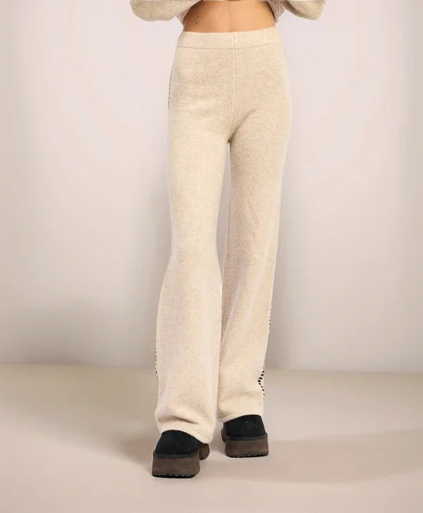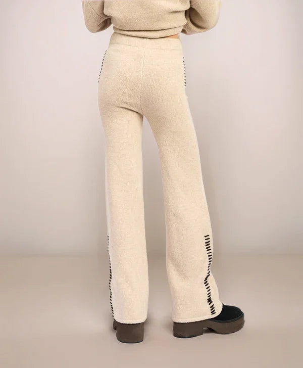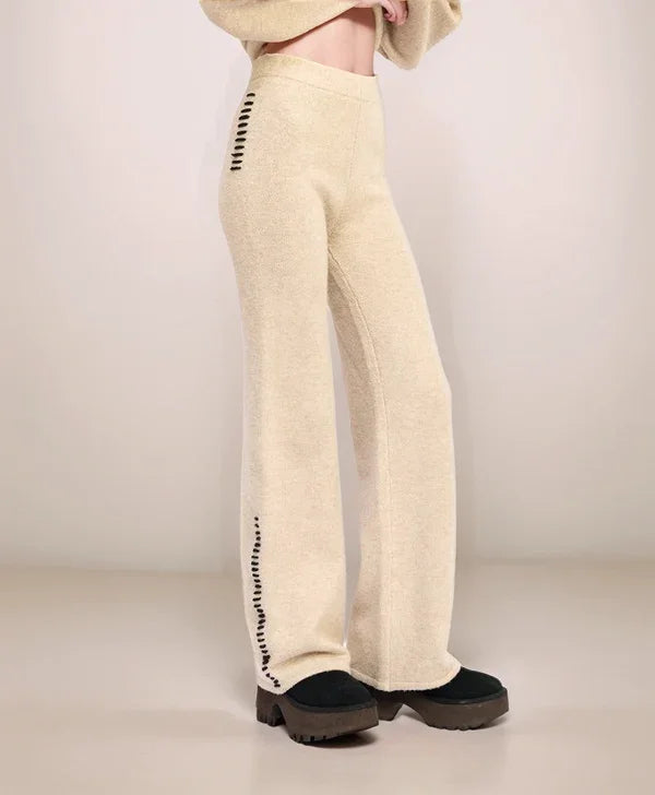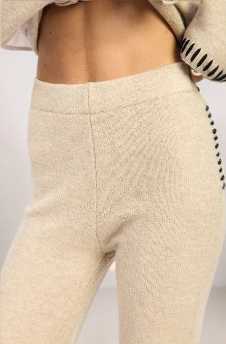 Crafted from a sumptuously soft and substantial knit in a timeless oatmeal hue. These sweater pants are designed for a flattering, comfortable fit. The silhouette begins with a smooth, high waist and flows into an elegant wide leg, creating a long, lean line. The true artistry is in the details. A contrasting black whipstitch runs down the side of each leg, adding a touch of handmade, rustic charm that is both unique and incredibly sophisticated.